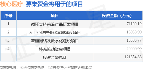证券之星音讯,深圳中心医疗科技股份有限公司(简称:中心医疗)拟在上交所科创板上市,募资总金额为12.17亿元,保荐人为华泰联合证券有限责任公司。征集资金拟用于循环支撑前沿产品研发项目、人工心脏产业化基地建设项目、营销网络及数字化建设项目、弥补流动资金项目,详见下表: